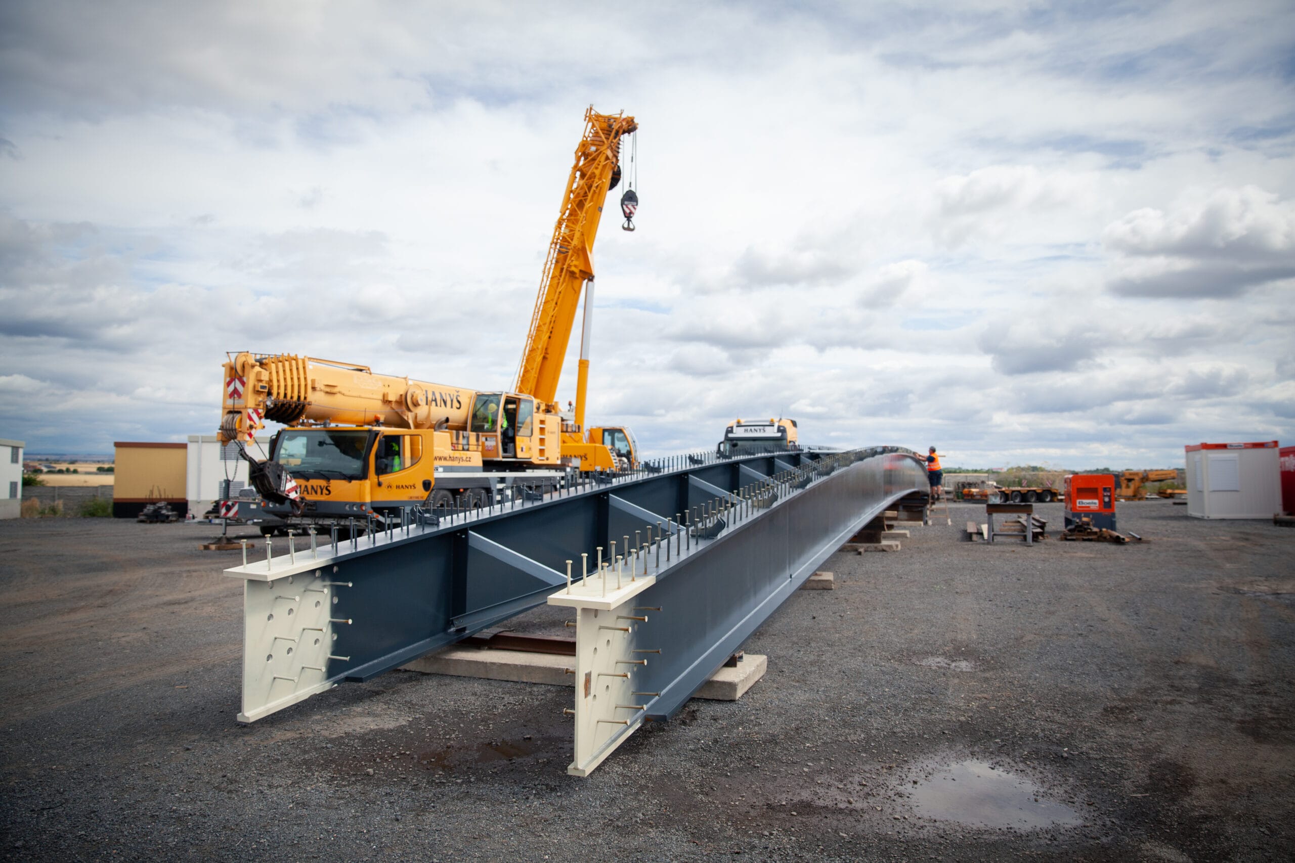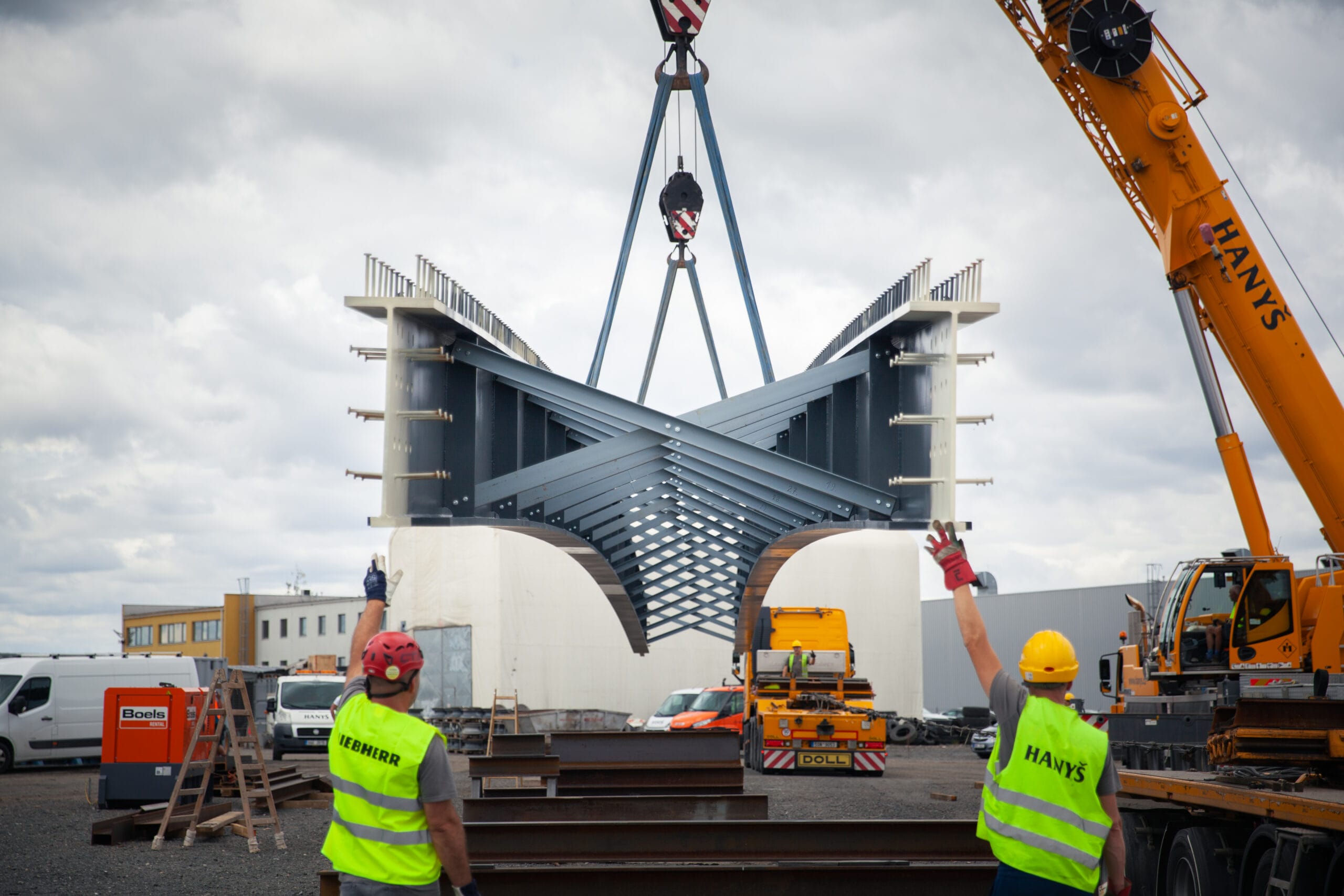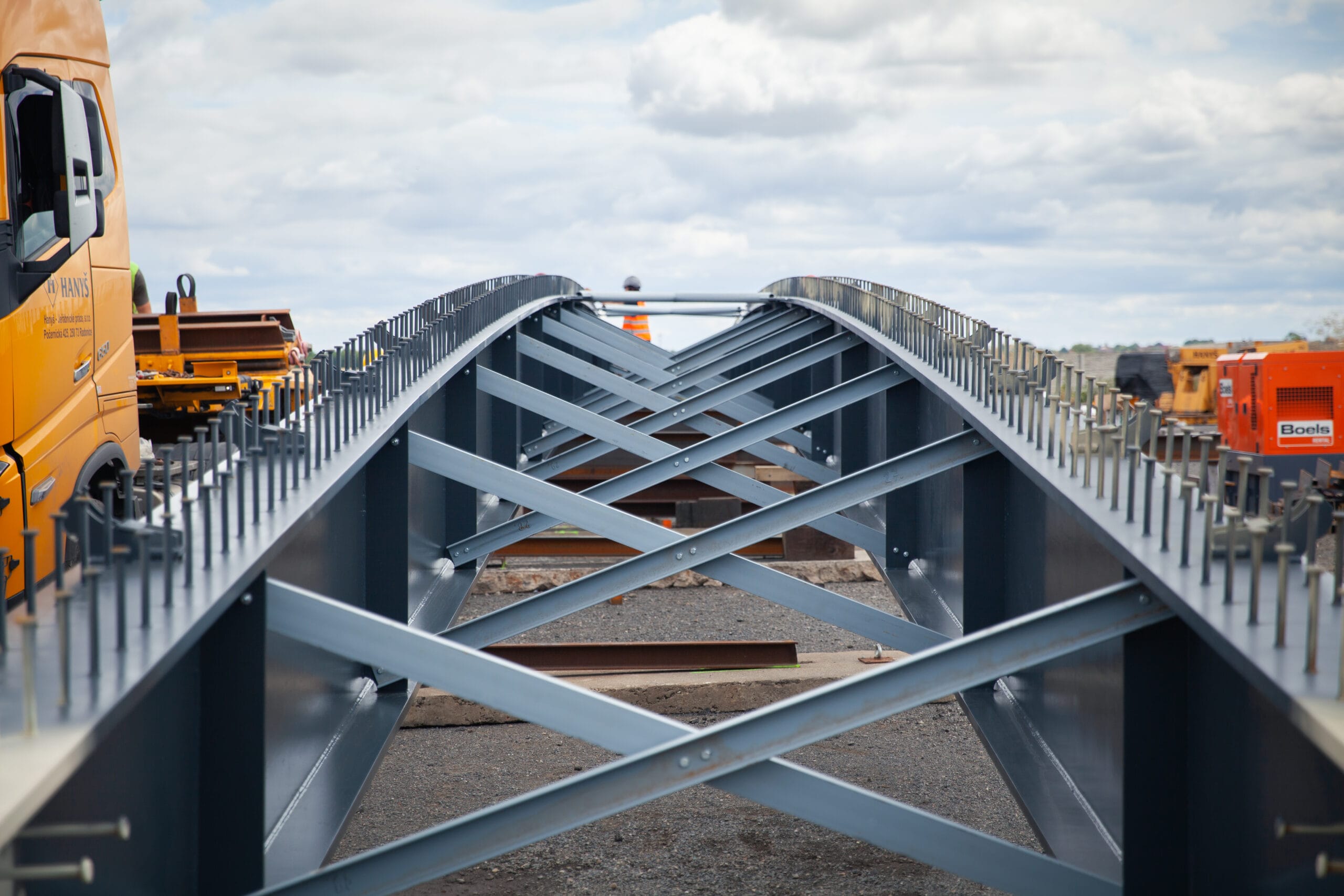 Lávku jsme dovezli do areálu firmy Hanyš v Radonicích, kde jsme oba nosníky svařily, provedli potřebné ultrazvukové zkoušky svarů a propojili je dočasným ztužením. Celá konstrukce pak byla dovezena na místo montáže a usazena do správné polohy. Součástí dodávky bylo také zábradlí jak na mostě, tak i na obou březích řeky Jizery.