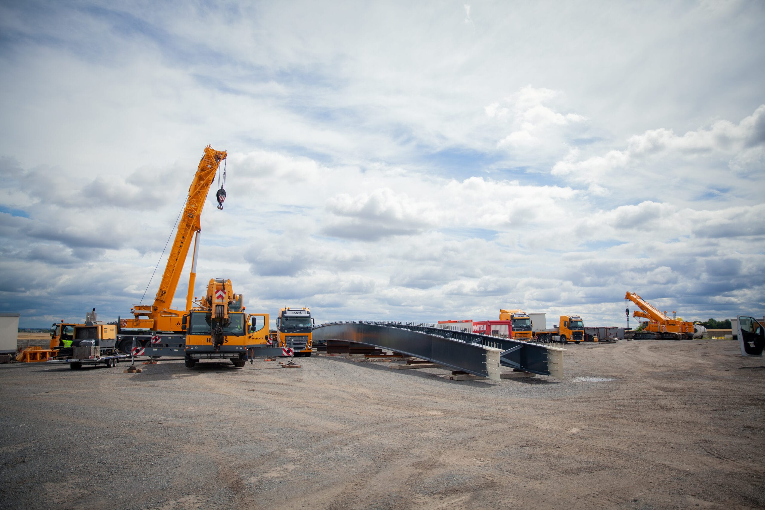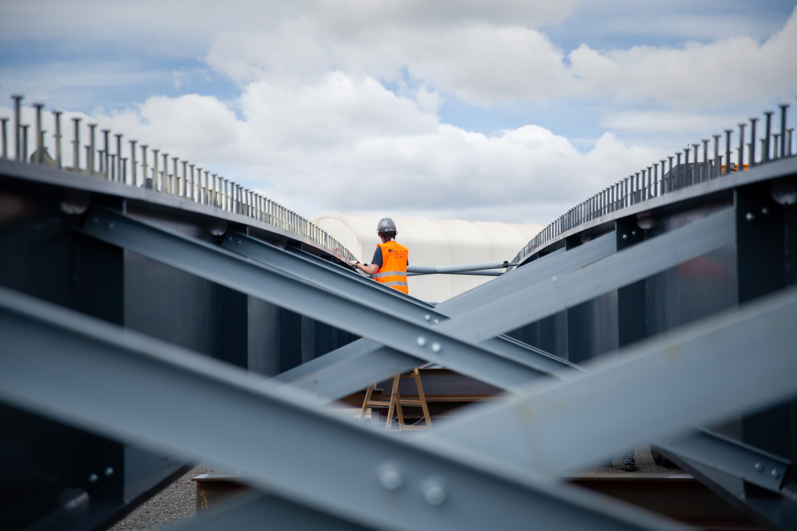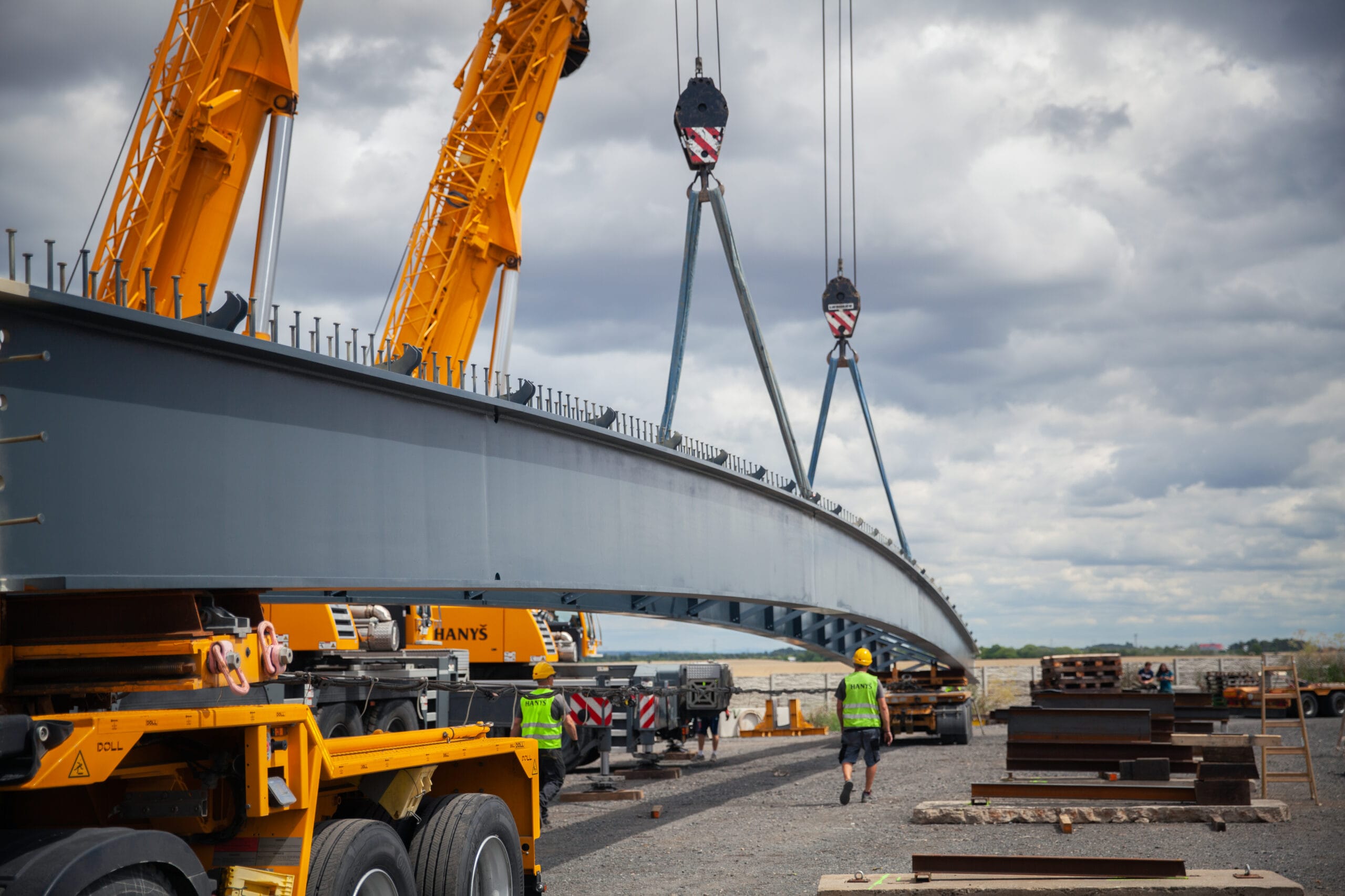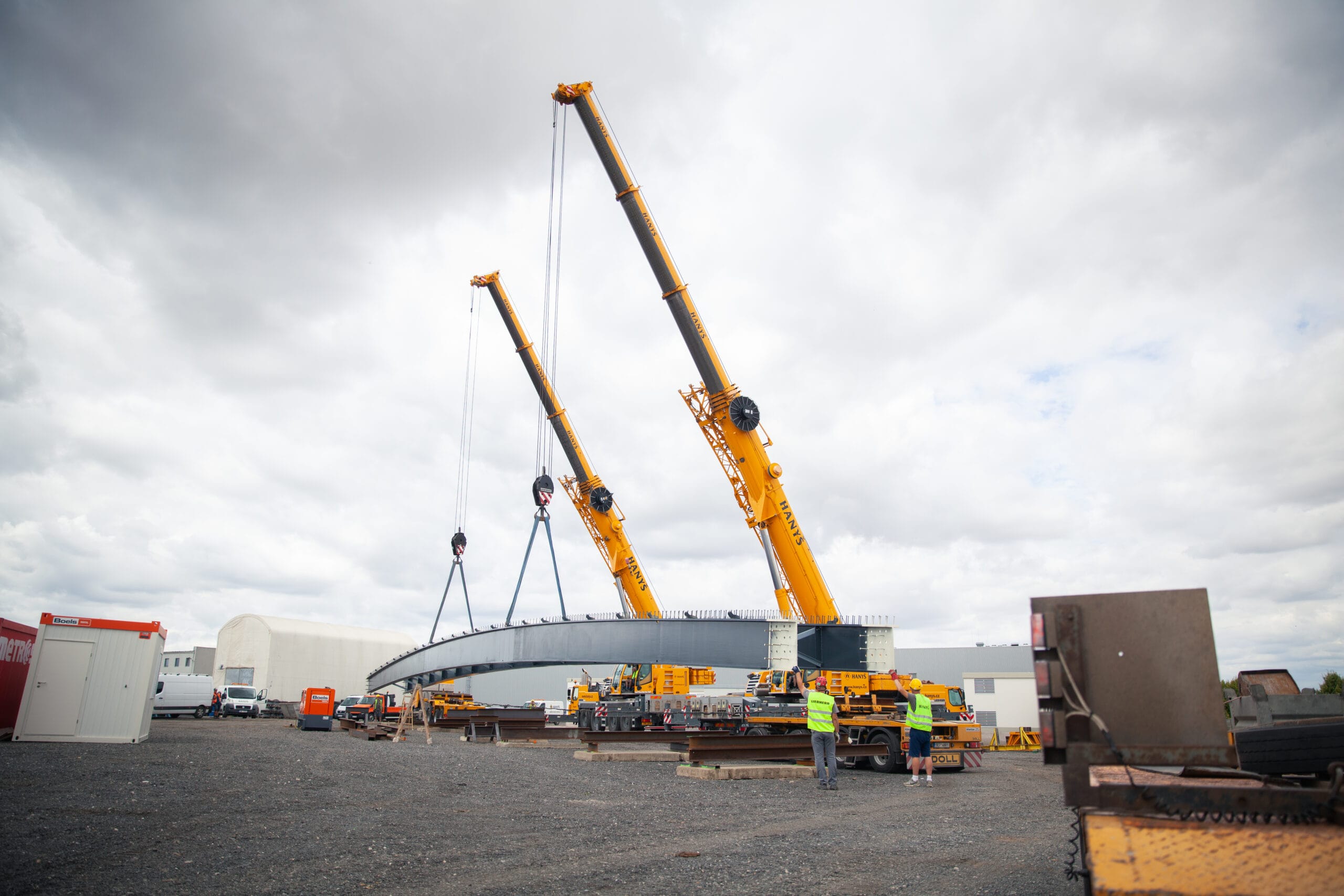 Lávku jsme dovezli do areálu firmy Hanyš v Radonicích, kde jsme oba nosníky svařily, provedli potřebné ultrazvukové zkoušky svarů a propojili je dočasným ztužením. Celá konstrukce pak byla dovezena na místo montáže a usazena do správné polohy. Součástí dodávky bylo také zábradlí jak na mostě, tak i na obou březích řeky Jizery.