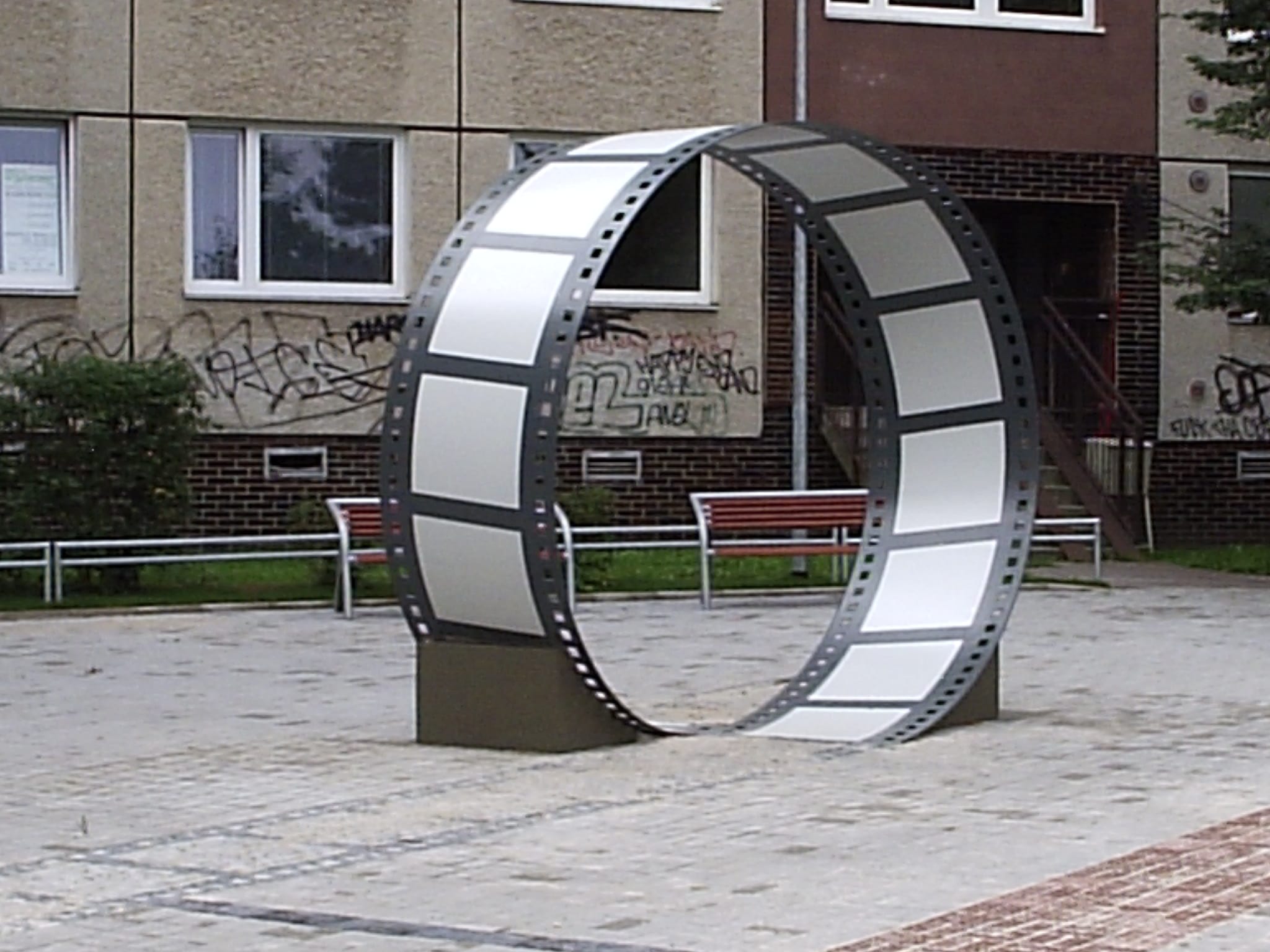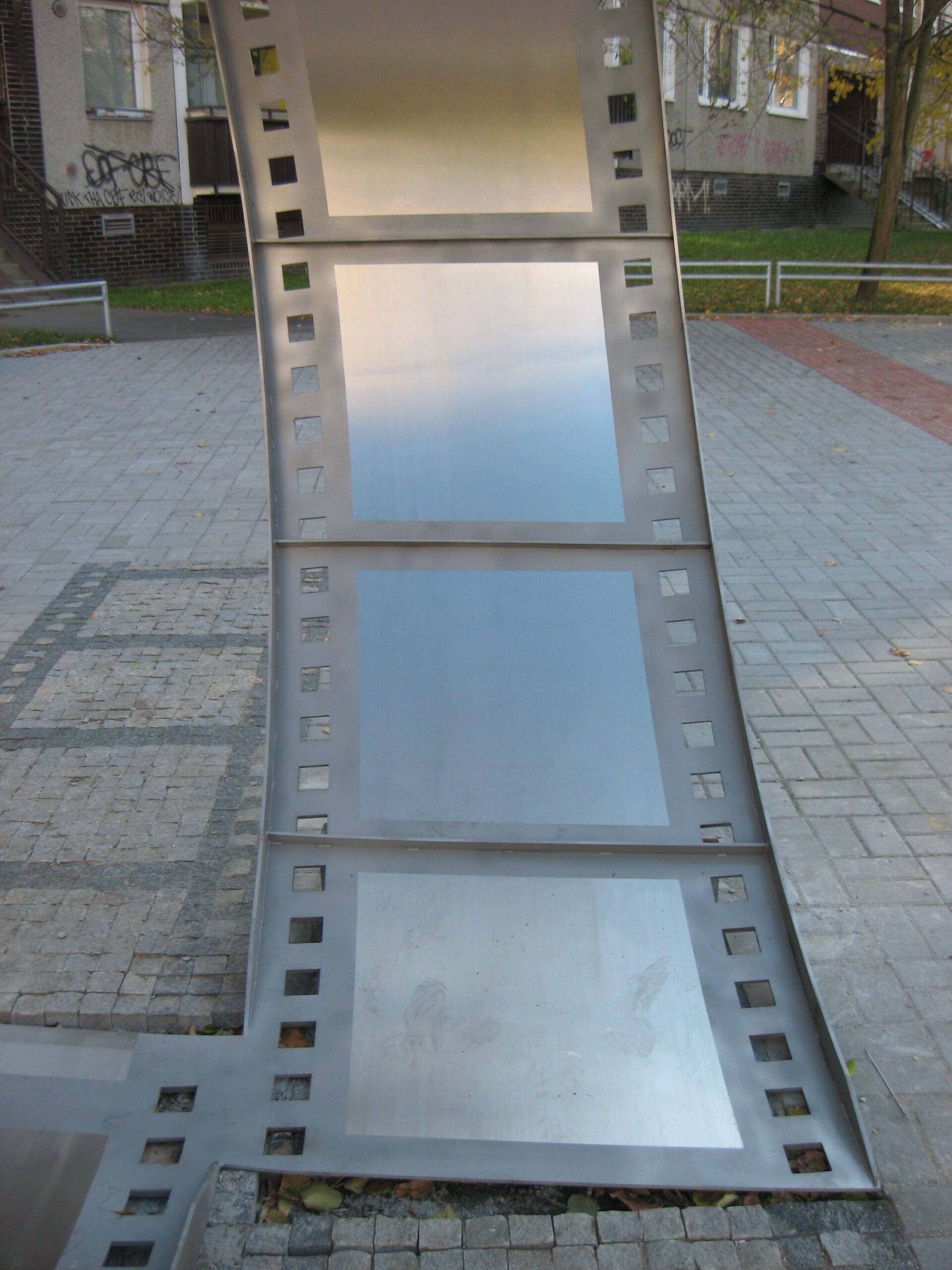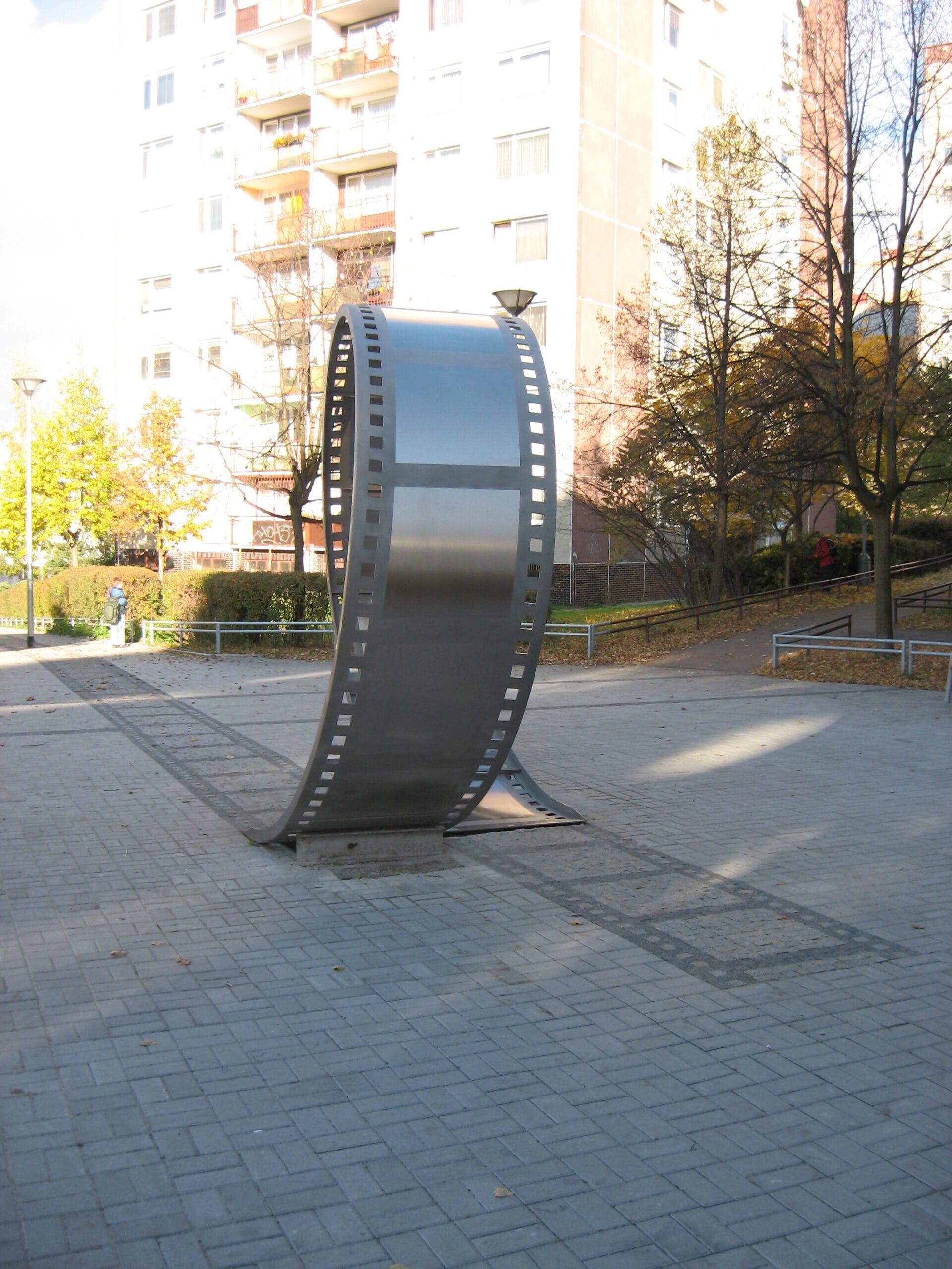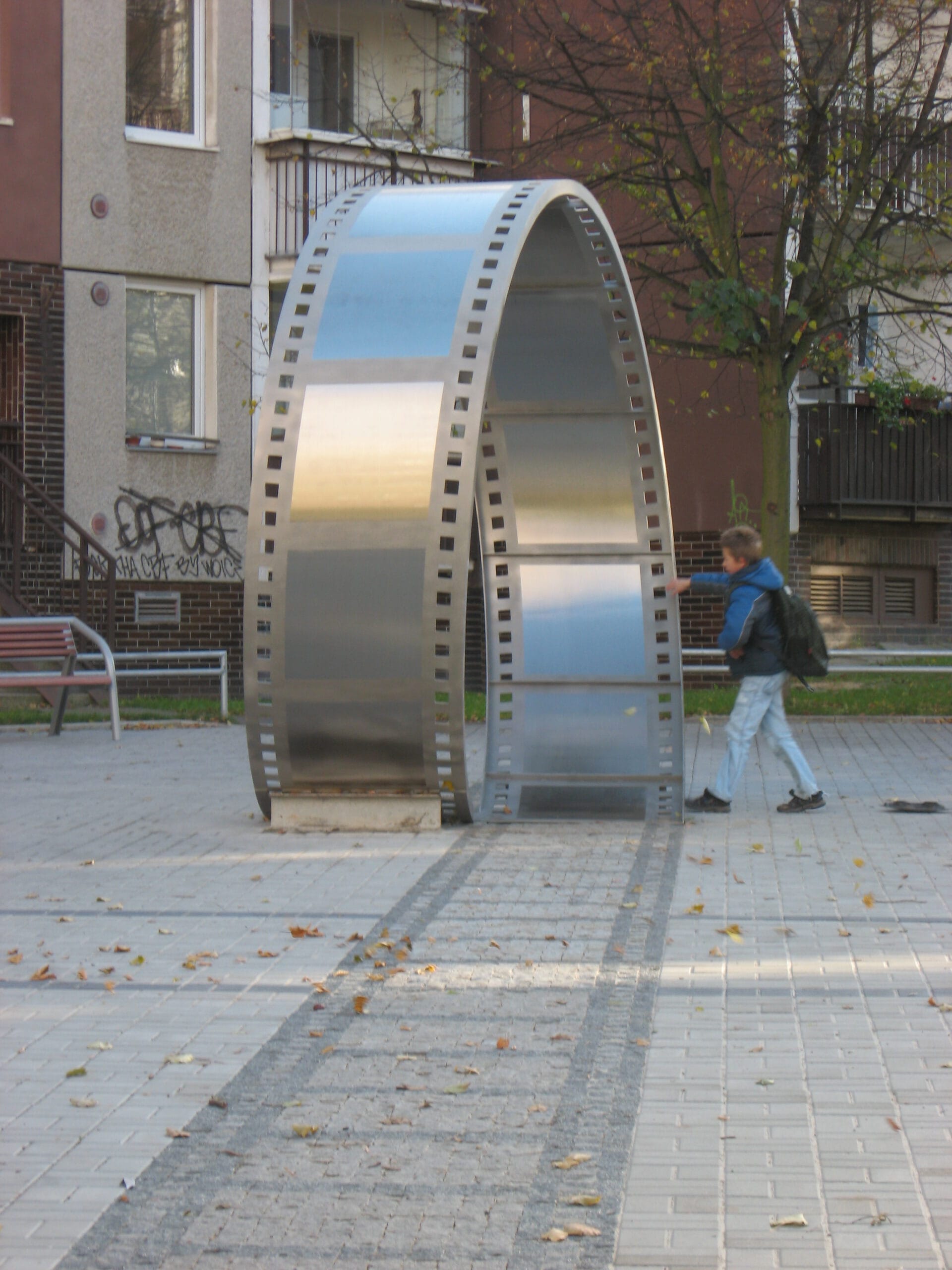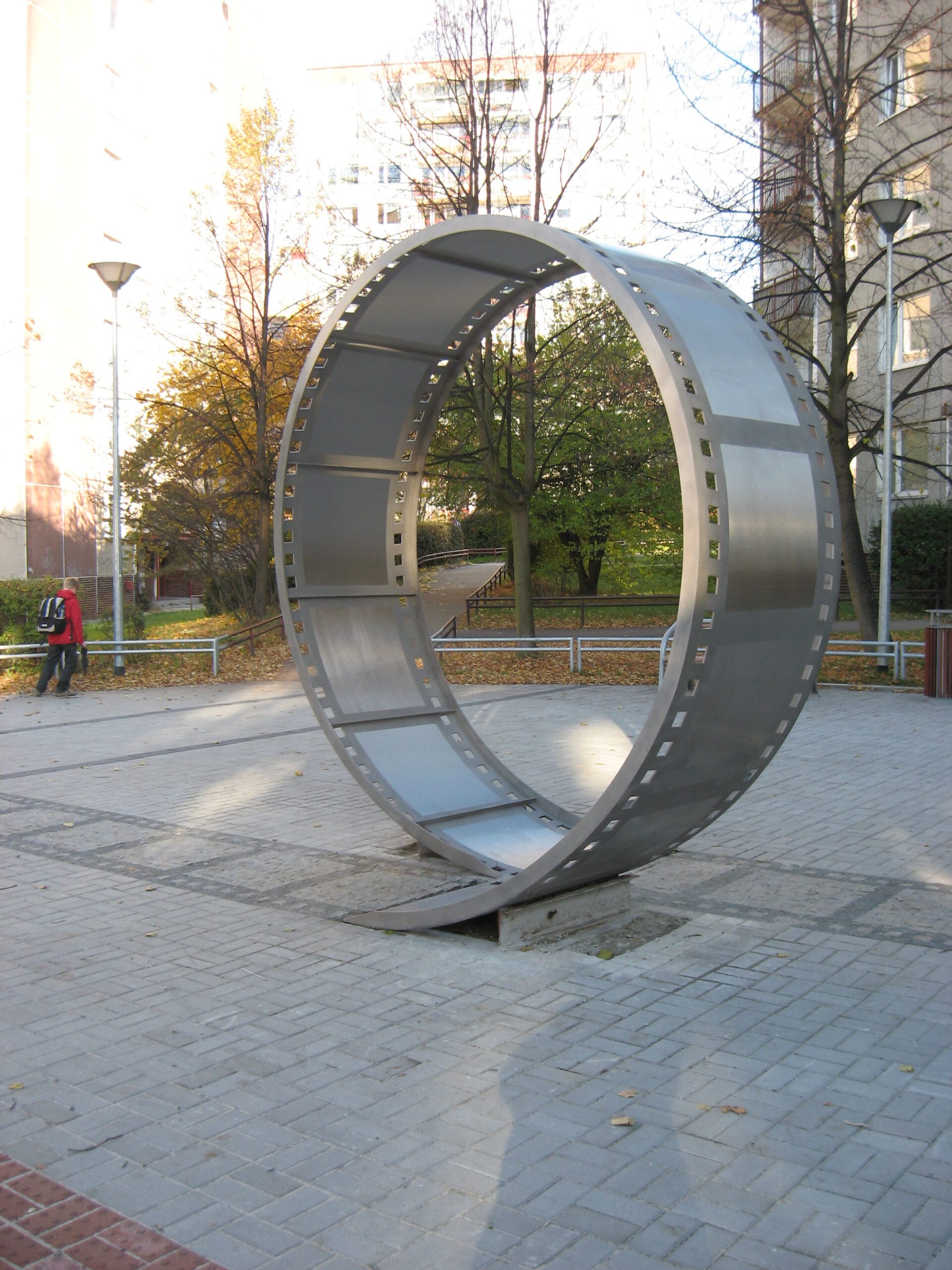 Jedná se o dekorativní nerezový svitek filmu na náměstí.